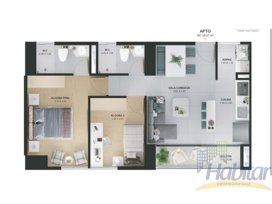 • Área Construida: 56.57 m²
